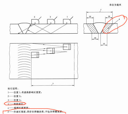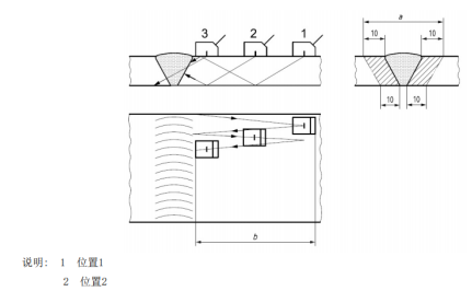 掃查面應足夠寬,以確保聲束覆蓋整個檢測區域(見圖2)。或者,如果能實現焊接接頭雙面掃查以確保聲束覆蓋整個檢測區域,可縮短掃查面寬度。掃查面表面應平滑,無焊接飛濺、鐵屑、油垢及其他外部雜質。掃查面表面的不平整度,不應引起探頭和檢測表面的間隙大于0.5mm。如果間隙超標,應修整掃查面表面。當遇到表面局部變化,如沿著焊趾掃查,導致探頭與表面的間隙大于1mm時,僅當在受影響部位增加至少一個其他角度的探頭進行補充掃查時才能被允許。該補充掃查應解決因間隙超標引起聲束未覆蓋整個檢測區域的問題。掃查面和聲束反射面應允許無于擾的耦合劑和反射物。